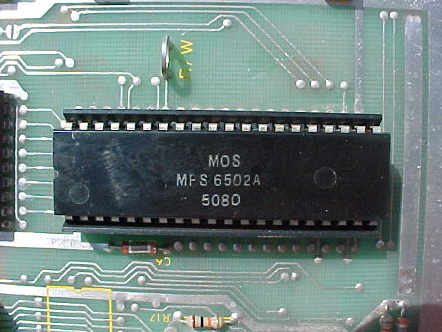 The 6502 CPU chip is a 40 pin (large) chip, located at C3