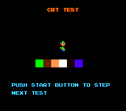 Following the general test mode operation instructions, put the game into test mode. (Press and hold the switch until the menu appears). Select the menu item "3-MONITOR ADJUSTMENT & SELF-TEST" by momentarily pressing the switch. Once selected, Press and hold the switch until the first diagnostic test screen appears. Press either start button to proceed to the next test. The test screens are shown below for reference. |