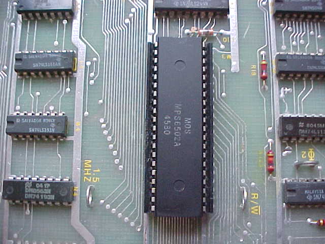 The 6502 CPU chip is a 40 pin (large) chip, located at M3